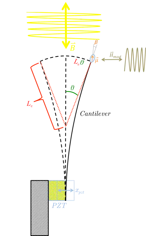 A cantilever with a magnetic particle oscillating in an external magnetic field. Many setups do not have a modulation coil as pictured above. Capacitive coupling can be used in place of a piezoelectric transducer (PZT) to drive the cantilever