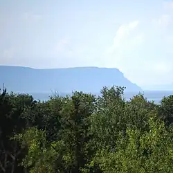 Cape Blomidon is located in Kings County at the northeast edge of the Blomidon Peninsula. Its geology largely comprises sedimentary sandstone, which is unique since it is connected to the North Mountain range and made up of tholeiitic basalt.[2] Cape Blomidon features distinctive reddish-coloured cliffs that reach up to 100 metres in height above the Minas Basin, which stretches out to the east. Cape Split is the geologic continuation of the North Mountain range and juts off the Blomidon Peninsula to the northwest. According to Mi'kmaq legend, Cape Blomidon is the home of Glooscap.