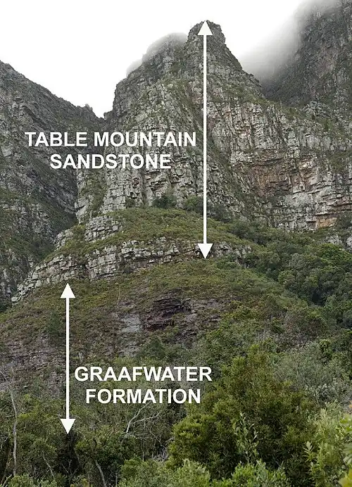 The first sediments into the initially still shallow, possibly inland, sea were alternating layers of maroon-colored mudstones and buff-colored sandstones, each mostly between 10 and 30 cm thick.[5] The mudstone units commonly display ripple marks from the ebb and flow of tidal currents, as well as polygonal sand-filled mud cracks that indicate occasional exposure to desiccation.[5] This layer, known as the Graafwater Formation, reaches a maximum thickness of 400 m,[12] but on the Cape Peninsula it is only 60–70 m thick.[5] No fossils have been found in the Graafwater rocks, but shallow-water animal tracks have been found.[6][12] A particularly good example of these tracks can be viewed in the foyer of Geology Department of the University of Stellenbosch, where a slab of Graafwater rock from the Cederberg mountains has been built into the wall.[7]