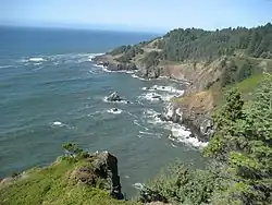 Cape Foulweather is a basalt outcropping 500 feet (150 m) above the Pacific Ocean on the central coastline of the U.S. state of Oregon - in Lincoln County, south of Depoe Bay. It is bisected by US Highway 101, with a pass elevation of approximately 550 feet (170 m), which is the fourth highest point of the highway in Oregon. The cape is notable as the first promontory on the northwest coast of New Albion (as the area was then known) to be sighted and named by Captain James Cook, while on his third voyage around the world. His March 7, 1778 journal entry reads: