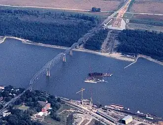 In June 1987, the Missouri Highway and Transportation Department approved design location of a new four-lane Mississippi River bridge to replace the deteriorating Cape Girardeau Bridge. In the final years of the bridge's existence, the safety of the structure was often questioned. Motorists both saw and felt the road deck shifting as they drove across the bridge. Portions of its road deck were worn down to the steel grid, to the point that the water below could be seen through small holes in the asphalt. Large chunks of rust were falling onto maintenance workers' heads, and photos circulated in the media showing the deteriorating roadway and a broken steel beam held up by a chain. In addition, inspections in 2002 resulted in the installation of clip angles for extra reinforcement.[2][3] As the bridge's rapid deterioration gained greater public attention in 2002 and 2003, traffic over it significantly decreased, resulting in a sharp drop in customers for businesses across the river in East Cape Girardeau.