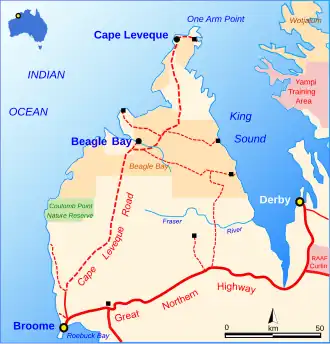 The Cape Leveque Road is a regional Western Australian road that runs through pindan woodland for 205 kilometres (127 mi) between Broome and Cape Leveque on the Dampier Peninsula.[1][2]