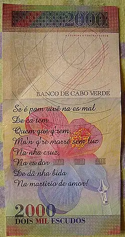 On 22 December 2014, the Banco de Cabo Verde introduced a new series of banknotes that honor Cape Verdean figures in the fields of literature, music, and politics. It consists of denominations of 200, 1,000 and 2,000 escudos issued in 2014, with the former now printed on polymer,[20] and banknotes of 500 and 5,000 escudos issued in 2015.[21]