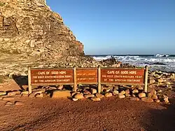The Cape of Good Hope (Afrikaans: Kaap die Goeie Hoop [ˌkɑːp di ˌχujə ˈɦuəp])[a] is a rocky headland on the Atlantic coast of the Cape Peninsula in South Africa.