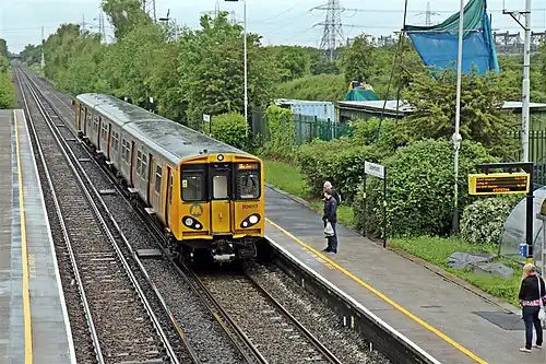 Trains between Chester and Liverpool call at Capenhurst every 30 minutes every day (including Sunday). The quarter-hourly service on the Chester line does not benefit Capenhurst since alternate trains run through the station non-stop between Hooton and Bache in each direction.[2] These services are all provided by Merseyrail's fleet of Class 507 and Class 777 EMUs.