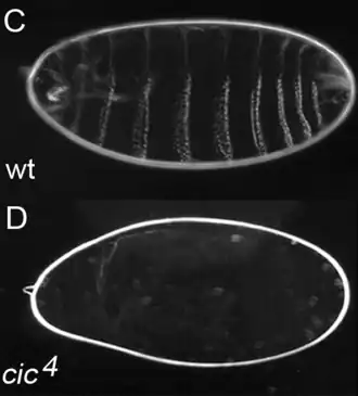 The CIC gene was first identified in Drosophila in 2000.[9] It was shown to encode a transcriptional repressor participating in the regulation of embryogenesis. In a mutated fly which at the embryonic stage had only the first and the last segments present, with the intermediate segments missing, scientists discovered a mutation of the CIC gene, and this prompted them to call the protein capicua ("head-and-tail" in Catalan).
