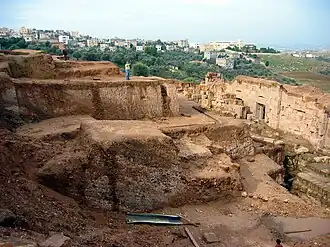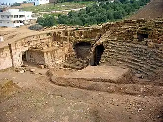 The city wall, with three north-facing gates,[5] can still be traced on the surface[3] Other remains include a temple of the Capitoline Triad, a three-tiered marketplace, a colonnaded street, a 5th-century church that was converted into a mosque in the 8th century, an aqueduct, reservoirs, a Roman military cemetery, and paved roads.[3][5] Although these remains were all excavated, many are quite minimal. The most prominent remains is that of the Roman style theatre.