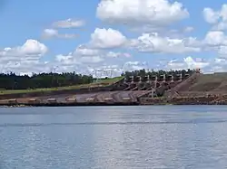 The Capivara Dam is an embankment dam on the Paranapanema River about 10 kilometres (6.2 mi) north of Porecatu, PR in Brazil. It is located along the border of the state of São Paulo to the north and the state of Paraná to the south. It was constructed between 1971 and 1978 for the primary purpose of hydroelectric power generation. The dam's first generator was commissioned in 1977. The dam can store up to 10,540,000,000 cubic metres (8,540,000 acre⋅ft) in its reservoir which also covers and area of 515 square kilometres (199 sq mi). It is operated by Duke Energy Generation Paranapanema International.[3]