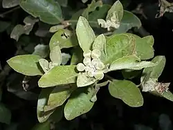 The leaves form between the spines and are alternate, oblong to broadly elliptic[3] (30-80 × 15–25 mm), greyish-olive green, covered in velvet hairs (or smooth); margins entire, rolled under.[2] The petiole is 4–12 mm long[1] and velvety.