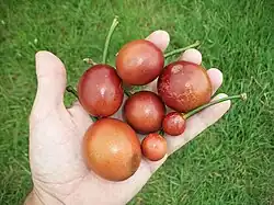 The fruits hang from a long (25–50 mm) stalk-like branch called a gynophore.[2][3] They are up to 40 mm (50 mm) in diameter; shiny green at first, ripening to pink or orange. The fruit contain many seeds embedded in a pinkish flesh.[1] Dried-out, emptied fruit may hang on the plant for some time.