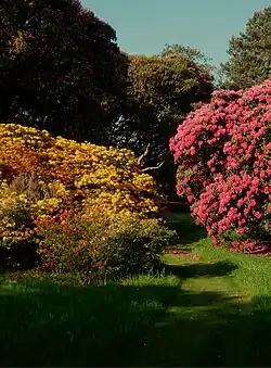 The landscaped gardens are the work of Lady Olivia Keane who, after years of neglect following World War II, designed the grounds. There are some fine trees, Japanese cedars, maples and a southern beech, and a venerable oak that is included in Owen Johnson's Champion Trees of Britain and Ireland. Higher on the slopes are terraces with rhododendrons, azaleas, camellias and magnolias, and everywhere, fine views over the surrounding countryside.[4]