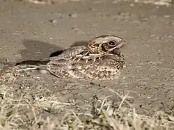 The Indian nightjar (Caprimulgus asiaticus) is a small nightjar which is a resident breeder in open lands across South Asia and Southeast Asia. Like most nightjars it is crepuscular and is best detected from its characteristic calls at dawn and dusk that have been likened to a stone skipping on a frozen lake - a series of clicks that become shorter and more rapid. They are sometimes spotted on roads when their eyes gleam red in the spotlight of a vehicle. There is considerable plumage variation across its range and can be hard to differentiate from other nightjars in the region especially in the field.