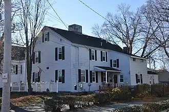 The Capt. Nathaniel Parker Red House is a historic house at 77–83 Ash Street in Reading, Massachusetts. It is a 2+1⁄2-story vernacular Georgian house, five bays wide, with entrances on its north and south facades. The southern entry is slightly more elegant, with flanking pilasters and a transom window. The house was built sometime before 1755, and was already a well-known landmark because it was (unusually for the time) painted, and served as a tavern on the coach road. The Tavern served as a meeting place for many revolutionaries and minute men, notably Marquis de Lafayette, and Alexander Hamilton. The house remained in the hands of militia captain Nathaniel Parker and his descendants into the late 19th century. The construction of the Andover Turnpike (now Main Street) in 1806–07, bypassing its location, prompted a decline in the tavern's business.[2][3]