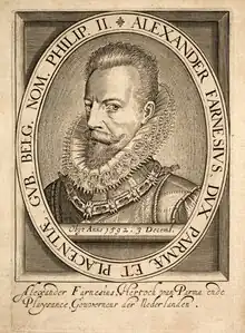 On April 10, 1589, the garrison of Geertruidenberg, composed of numerous English and some Dutch troops commanded by Governor Sir John Wingfield, surrendered the city to the Army of Flanders led by Don Alexander Farnese, Governor-General of the Spanish Netherlands (Spanish: Alejandro Farnesio).[2][3] A few days before, when pay did not arrive in time, the English soldiers mutinied, and was rumored that Wingfield had intended to surrender (or "sold") the city to the Spaniards.[4] The States-General and Prince Maurice of Nassau (Dutch: Maurits van Oranje) accused him of treason for its surrender, but Wingfield denied the charges against him. The fact was that Geertruidenberg was in Spanish hands.[2][3]