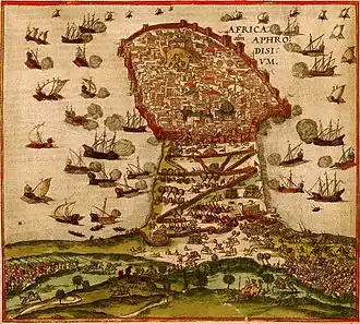 The Spanish fleet set sail to Mahdia on 24 June 1550 and arrived there four days later. The city was defended by the nephew of Turgut Reis, Hesar, who had spent two months locking cattle and storing rice and beans enough to feed the city for a year, in anticipation of being under siege.[5] The landing of the Spanish troops took place under the protection of the galleys' cannons and out of Mahdia's gun reach.[7] Within hours the Ottoman infantry and cavalry were driven out of a hill they occupied, and to the next day the city was completely surrounded by trenches dug six hundred meters from the walls.[7] Luis Pérez de Vargas, mayor of the castle of La Goulette, who was in command of the Spanish artillery, ordered to install several heavy pieces on the hill occupied the previous day to cover the locations of the 18 lighter pieces that had detached to beat the walls.[7] The same day the first assault was launched, but it was repelled because the moat had not been filled.[7] Despite advancing the artillery close to the walls and improving the trenches, the besiegers, harassed continuously by sallies of the Ottoman garrison, did not make significant progresses in the following days.[7]