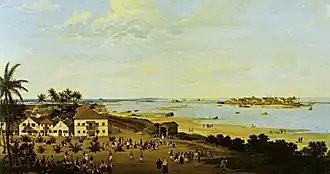 The Portuguese however intended to drive the English away so made several attempts at retaking the town, but each time assaulting the fortified isthmus they were repelled with heavy losses.[1] The next attempt was made via the waters; blazing rafts were sent down the river and at the same time an attempt by fire-ships on sea was also made but these attempts were frustrated by Lancaster.[10][11]