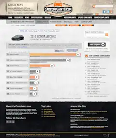 CarComplaints.com is an online automotive complaint resource that uses graphs to show automotive defect patterns, based on complaint data submitted by visitors to the site. The complaints are organized into logical groups with data published by vehicle, vehicle component, and specific problem. The average cost to fix, average mileage at failure, common solutions and individual owner comments are shown for each problem group. There is no charge or user signup required to access the complaint data, although user registration is required in order to submit a car complaint.[1]