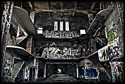 After its abandonment, the building was heavily looted and inhabited by non-Spaniards. Most of the prison walls were covered with graffiti, some of them very elaborate. A lengthy debate took place between the neighbours of Carabanchel and Aluche, who wanted a hospital and other public facilities to be built in the area,[15] and the local authorities, who wanted to privatize the land for housing development. The neighbours also wanted part of the prison to be preserved.