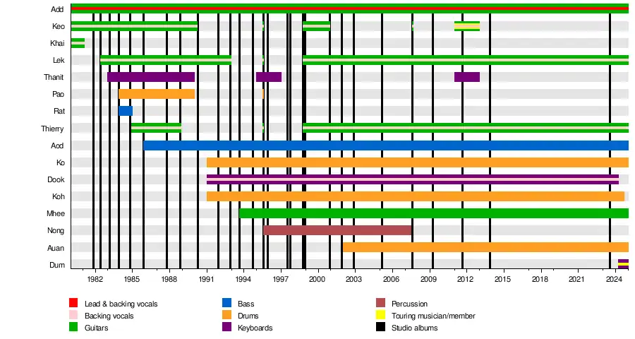 Since then, the band has recorded several more albums, with another recent upsurge in critical and commercial success. They have now released a total of 28 official studio albums (Vol. 1 - Vol. 28 / 1981 - 2013), with some special albums, numerous live albums and compilations bringing the total to more than 60.[6] The lineup has also remained stable, although percussionalist Nong left the band due to illness after their 25th albums, and later died. Additionally, classic-era members Keo (Khiao) and Ajaan have occasionally appeared on their post-millennium albums and live shows, though they have not been official members for years.