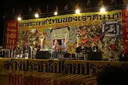 The band supported the People's Alliance for Democracy (PAD or the "Yellow Shirts") and frequently played during their protests against then prime minister Thaksin Shinawatra in 2006 and the anti-government protests 2008.[6] Members of the band also appeared in support of the anti-Pheu Thai government People's Democratic Reform Committee (PDRC or the "Whistleblowers) in the protests between November 2013 and May 2014.
