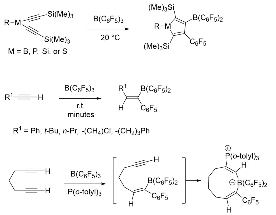 - ^ a b Kehr G.; Erker, G. (2016). "Advanced 1,1-carboboration reactions with pentafluorophenylboranes". Chemical Science. 7 (1): 56–65. doi:10.1039/c5sc03282b. PMC 5508682. PMID 28757997.