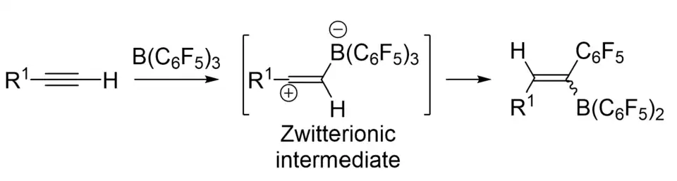 Wrackmeyer-type 1,1 carboboration is proposed to go through a zwitterionic intermediate, and this intermediate has been isolated and characterized in some cases.[4][5][6] However, the mechanism can be highly substrate and reagent dependent.