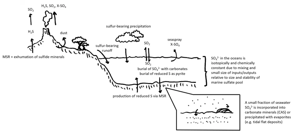 Earth's sulfur cycle is complex. Volcanoes release both reduced and oxidized sulfur species into the atmosphere, where they are further oxidized by reaction with oxygen to SO2 and various sulfates. These oxidized sulfur species enter groundwater and the oceans both directly (rain/snow) or by incorporation into biomass, which decays to sulfates and sulfides, again by a combination of biological and abiological processes.[31][32] Some of this sulfate is reduced through microbial metabolism (microbial sulfate reduction or MSR) or by hydrothermal processes, yielding sulfides, thiosulfate, and elemental sulfur. Some reduced sulfur species are buried as metal-sulfide compounds, some are cyclically reduced and oxidized in the oceans and sediments indefinitely, and some are oxidized back into sulfate minerals, which precipitate out in tidal flats, lakes, and lagoons as evaporite deposits or are incorporated into the structure of carbonate and phosphate minerals in the ocean (i.e. as CAS).[33][34][35][36][37][38][39]