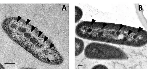 - ^ Drews G, Niklowitz W (1956). "[Cytology of Cyanophycea. II. Centroplasm and granular inclusions of Phormidium uncinatum]". Archiv für Mikrobiologie. 24 (2): 147–162. doi:10.1007/BF00408629. PMID 13327992. S2CID 46171409.