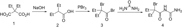 Diethylmalonic acid [510-20-3] (1) is decarboxylated to 2-ethylvaleric acid [20225-24-5] (2). The Hell-Volhard-Zelinsky reaction converts this to 2-Bromo-2-Ethylbutyryl Bromide [26074-53-3] (3). Reaction with urea with affords carbromal (4).