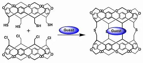 The first generation carcerands are based on calixarene hemicarcerands with 4 alkyl substituents on the upper rim and 4 reactive substituents on the lower rim. The coupling of both hemicarcerands takes place through a spacer group. In the original 1985 publication two different hemicarcerands react, one with chloromethylene reactive groups and one with thiomethylene reactive groups in a nucleophilic displacement and the resulting spacer group is a dimethylsulfide (CH2SCH2). In this experiment the guests were the molecules already present in the reaction medium such as argon and dimethylformamide.