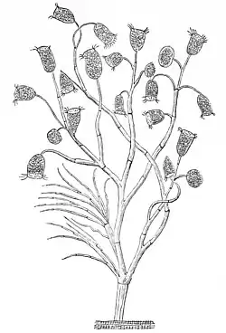Carchesium is a genus of usually colonial peritrich ciliates in the Vorticellidae with a spirally contractile stalk.[1][2] The inverted bell-shaped cells have an oral lip as in Epistylis.