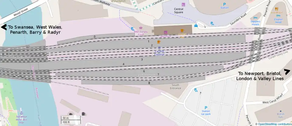 Cardiff Central has eight platforms, numbered 0, 1a/b, 2a/b, 3a/b, 4a/b, 6a/b, 7a/b and 8. There is no longer, despite signage, a Platform 5; this was a west-facing bay platform situated between Platforms 3 and 4 which was removed in the 1960s.[38][39] Platform 0, a short through platform at the north of the station was created in 1999.[12][30]