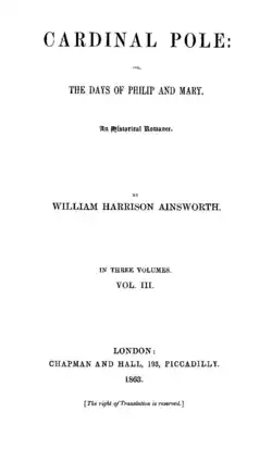 Cardinal Pole is an 1863 historical novel by the British author William Harrison Ainsworth.[1] [2] After being serialised in Bentley's Miscellany it was published in three volumes by Chapman and Hall. It set during the mid-sixteenth century and revolves around cardinal Reginald Pole during the reign of Mary I of England. It functions as an effective sequel to the author's 1840 novel The Tower of London.[3]
