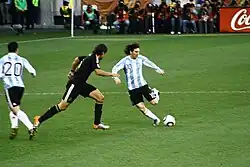 Already frequently compared to compatriot Diego Maradona, Messi proved their similarity when he nearly replicated Maradona's two most famous goals in the span of seven weeks.[39] On 18 April, in a Copa del Rey match against Getafe, he ran 60 metres (66 yd) with the ball, beating five defenders before scoring with an angled finish in a remarkably similar fashion to Maradona's Goal of the Century.[40][41] A league match against Espanyol on 9 June saw him guide the ball past the goalkeeper with his hand in similar fashion to Maradona's Hand of God goal.[42] As Messi continued his individual rise, Barcelona faltered; the team failed to reach the Copa del Rey final after Messi was rested during the second leg against Getafe and lost the league to Real Madrid on head-to-head results.[43][44]