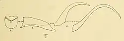The radula is small and rather obscure. The uncini cover the median rows, and cross even the uncini of the opposite side. The rhachidian or median tooth has a subquadrate basal part, with rounded, convex posterior and less convex lateral margins. It has a broad, triangular cusp, with one small median denticle and about 6 smaller ones on each side. The laterals one on each side have a transversely triangular shape, with an unarmed, arched upper and concave proximal and basal margin, with blunt points at the proximal and distal extremities of the basal margin. On each side are 3-4 uncini which are long, slender and strongly curved. Though this radula has some resemblance with that of Aporrhais, Verrill stated[4] that it should be taenioglossate, as the "Siboga"-specimen has a radula with at least 9 rows of teeth and probably 11.