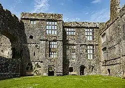 Entry to the inner ward is across a dry moat that had a barbican and gatehouse. The front of the castle had three D-shaped towers and crenelated walls. The rear of the castle has two large round towers. In the 16th century the northern defensive wall was converted into a Tudor range with ornate windows and long gallery.