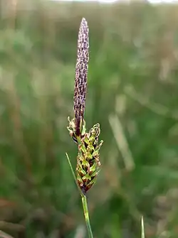 Carex binervis, the green-ribbed sedge,[2] is a European species of sedge with an Atlantic distribution. It is found from Fennoscandia to the Iberian Peninsula, and occurs in heaths, moorland and other damp, acidic environments. It typically grows to a height of 15–120 cm (6–50 in), and has inflorescences comprising one male and several female spikes, each up to 45 mm (1.8 in) long. The utricles have two conspicuous green veins, which give rise to both the scientific name and the common name of the species. In the vegetative state, it closely resembles C. bigelowii, a species that usually grows at higher altitude. C. binervis was first described by James Edward Smith in 1800, and is classified in Carex sect. Spirostachyae; several hybrids with other Carex species are known.