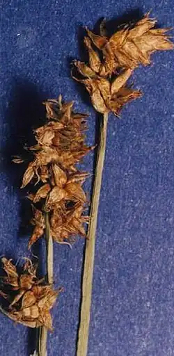 Carex nervina forms thick clumps of spongy, winged stems up to about 70 centimeters tall. The inflorescence is a dense cluster of a few compact spikes up to 3 centimeters long. The fruit is coated in a shiny green or brown toothed perigynium.