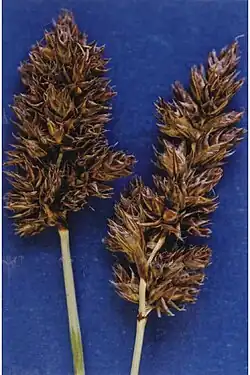 The plant is generally dioecious, with individual plants bearing male or female flowers, but not both. The male, staminate inflorescence is usually longer and more narrow than the oval-shaped female, pistillate spike. Female flowers bear fruits which are coated in dark brown, shiny, pointed perigynia.
