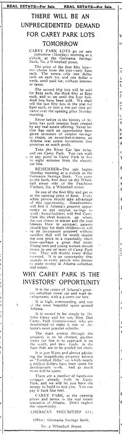 In 1913, the neighborhood was subdivided, with lots offered for sale that same year (see advertisement). The sellers/developers were listed as "John Carey and his son Hon. Dan Carey, Park Commissioner". The 1913 advertisement offers the first fifty lots for sale for $200.00 each. The terms for these first fifty lots was advertised as being $1.00 down, "and one dollar a week, until paid for, without interest or taxes."
