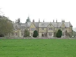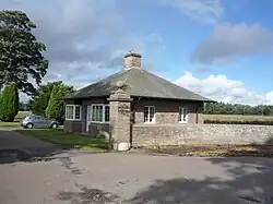 Carham Hall and its associated estate lies in northern Northumberland immediately south of the River Tweed which, at this point, marks the modern border with Scotland (the border swings southwards, away from the Tweed west of Carham). The current hall has some Jacobethan styling but is demonstrative of the Scottish influence on this part of Northern England. It is described as a good example of the later work of architect James Bow Dunn, with subtle and elegant detailing. The structure is linear in nature, facing to the south to overlook the associated park. The hall is built of buff-coloured sandstone, dressed with pink sandstone; the roof is covered with Devonian flagstones. The windows have mullions and transoms. The roof has kneelers, ridged copings and multiple corniced chimney stacks on the ridge.[1]