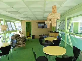 The motel opened in 1957, and had one of the wildest designs in the post-World War II era, incorporating a crescent-shaped pool, a levitating ramp, and canted glass walls.[3] At the time it was proposed, no neon sign as big as the Caribbean Motel's had ever been installed in Wildwood Crest; however, after much deliberation, the town disallowed it.[4]