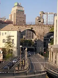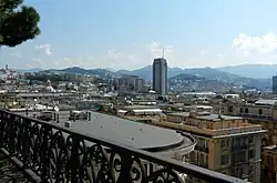 The old working-class blocks of flats in Via Madre di Dio, Via dei Servi and Via del Colle (Cheullia), in a state of decay for some time,[17] partly damaged or destroyed by the bombing of World War II, with the systematic application of the urban plan carried out between 1969 and 1973 disappeared completely to make way for modern business centers, housing the offices of the Region of Liguria, municipal bodies and private companies.[8][18] In the postwar period, the need had become pressing to create modern workspaces, accessible by roads suitable for the growing automobile traffic and equipped with parking and services. The area chosen for the new settlements was that of the old Borgo Lanaioli, now in a state of decay and largely damaged by bombing.