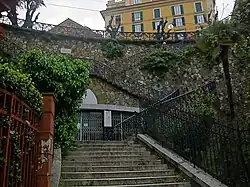 Before the nineteenth-century urban development, the hill of Carignano could only be reached by steep cobblestones, the typical Ligurian creuze, some of which, such as Salita San Leonardo, Salita Santa Maria in via Lata, Via San Giacomo di Carignano, and Salita dei Sassi, have partly survived urbanization, although intersected by the modern road system.[9] Almost nothing, however, has remained of the streets and alleys of the Hill area (between Via Madre di Dio and Via del Colle).
