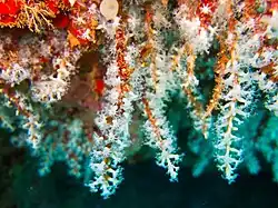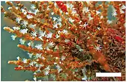 Carijoa riisei, the snowflake coral or branched pipe coral, is a species of soft coral in the family Clavulariidae. It was originally thought to have been native to the tropical western Atlantic Ocean and subsequently spread to other areas of the world such as Hawaii and the greater tropical Pacific, where it is regarded as an invasive species. The notion that it is native to the tropical western Atlantic was perpetuated from the fact that the type specimen, described by Duchassaing & Michelotti in 1860, was collected from the US Virgin Islands. It has subsequently been shown through molecular evidence that it is more likely that the species is in fact native to the Indo-Pacific and subsequently spread to the western tropical Atlantic most likely as a hull fouling species prior to its original description.[2]