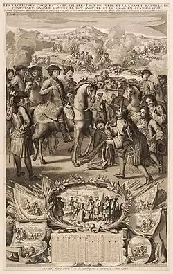 During 1690 and 1691 the Dutch Republic negotiated with Sweden for volunteers to fight in the war against France. The Swedish King provided 6,000 men, and Rehnskiöld, with the King's blessing, traveled to the Netherlands in the late summer of 1691. For three months he served as a military observer and military tutor to Prince Frederick of Holstein-Gottorp. Rehnskiöld reported to Charles XI on King William III and the Grand Alliance's joint operations, and the lack of discipline among the Allied forces.[11] Rehnskiöld had to personally intervene in a disciplinary trial between the young Swedish officers Axel Gyllenkrok and Carl Magnus Posse. They volunteered for the French Army and tried to escape to the Allied camp in Flanders, where they were arrested but were released after they protested. Charles XI ordered Rehnskiöld to express his stern dissatisfaction to the young officers; through their undisciplined course of action, they had earned the condemnation of the foreign soldiers and, according to the King, they should have acted in accordance with prevalent soldierly manners.[13][14]