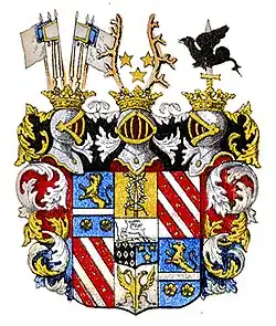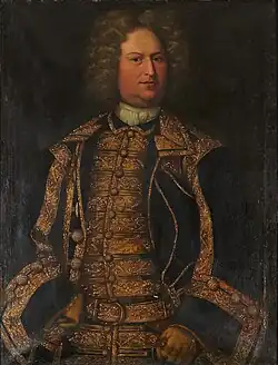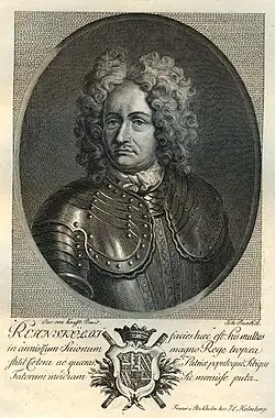 Rehnskiöld was born on 6 August 1651 in Stralsund in Swedish Pomerania. His parents were the government councillor of Pomerania, Gerdt Antoniison Rehnskiöld (1610−1658), originally Keffenbrinck, and Birgitta Torskeskål (died 1655), niece of Baron Johan Adler Salvius.[2][3] Keffenbrinck's ancestors came from Westphalia, and their seat was the castle of Rehne in the northern part of the Münsterland province. Gerdt Rehnskiöld initially served as a scribe in Kammarkollegium, and later as the authorized representative of the Crown at King Gustavus Adolphus' administrative entourage during the King's military campaign in Germany. Thanks to his efforts in the maintenance of the Swedish troops during the Thirty Years War, he became a naturalized Swedish nobleman in 1639 by Queen Kristina and adopted the name Rehnskiöld after his family seat. He was also awarded the Griebenow, Willershusen, and Hohenwarth estates in Pomerania, as well as Stensättra farm in Södermanland. In 1640, the Rehnskiöld family was introduced in the House of Nobility at number 270.[4][5][3]