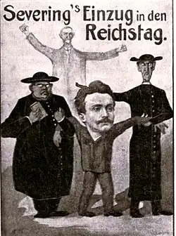 Severing's political views became markedly more radical during his years in Switzerland. His criticism of the politics of the Social Democrats led him to resign from his functions in the Workers' Educational Association.[3] In his speeches he frequently spoke of world revolution and no longer only of improving the political and social condition of the workers. He observed from a distance that the SPD in East Westphalia was beginning to follow a distinctly pragmatic course and that the party was considering taking part in the Prussian state election, which tended to be viewed with scorn because of the Prussian three-class franchise that weighted votes based on the amount of taxes paid.