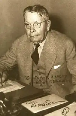 Carl Thomas Anderson was born in Madison, Wisconsin,[1][2] the son of Norwegian immigrants. Anderson initially worked in his father's planing mill in Des Moines, Iowa,[2] where he developed carpentry skills, became a cabinetmaker, and invented a patented folding desk, which is still being manufactured today. Near the end of the 19th century, he traveled the United States, drifting to Omaha, San Francisco, and Seattle, where he worked until the city's 1889 fire.[3][4]