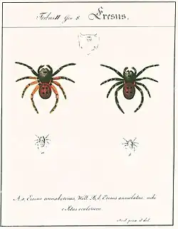 Firstly, it includes nine still-valid first descriptions of spider species. In the 19th century not unusually, a majority of "new species" had been previously described by other authors, because in contrast to the modern differentiation of species, the genital structures were not taken into consideration at that time. For that reason, smaller differences in the colourings and markings have possibly given rise to different species designations. At any rate, a sixth of the forms described by Hahn are still valid today. That Hahn was a good observer and gave exact descriptions is shown clearly by the example of Eresus annulatus (= E. sandaliatus (Martini & Goeze>, 1778)) and E. cinnaberinus (= E. kollari Rossi, 1846). After more than 150 years, arachnologists follow his separation of these taxa today again.[21][22][23][24]